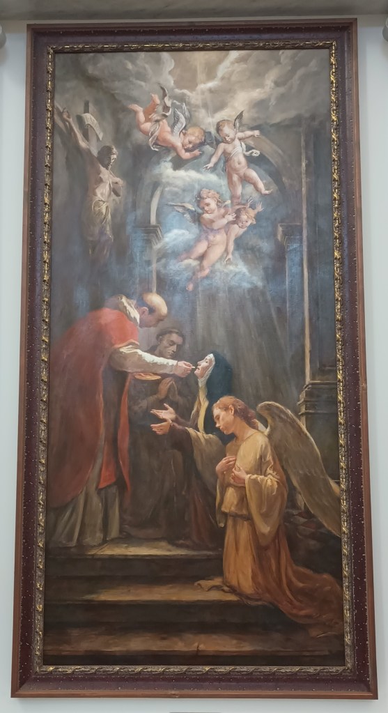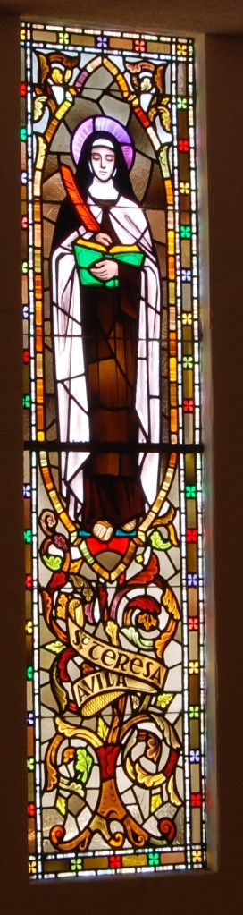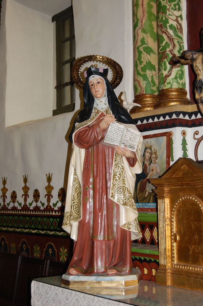 Symbols: Carmelite habit, biretta (hat), pen, book, dove, angel with dart, crucifix, lily, heart, crowned with thorns